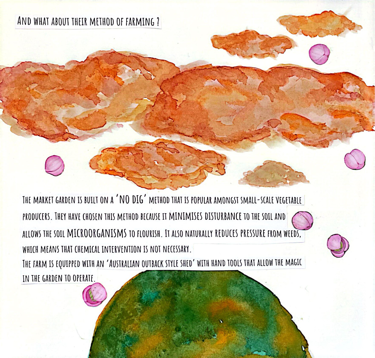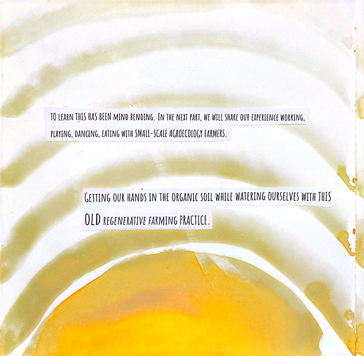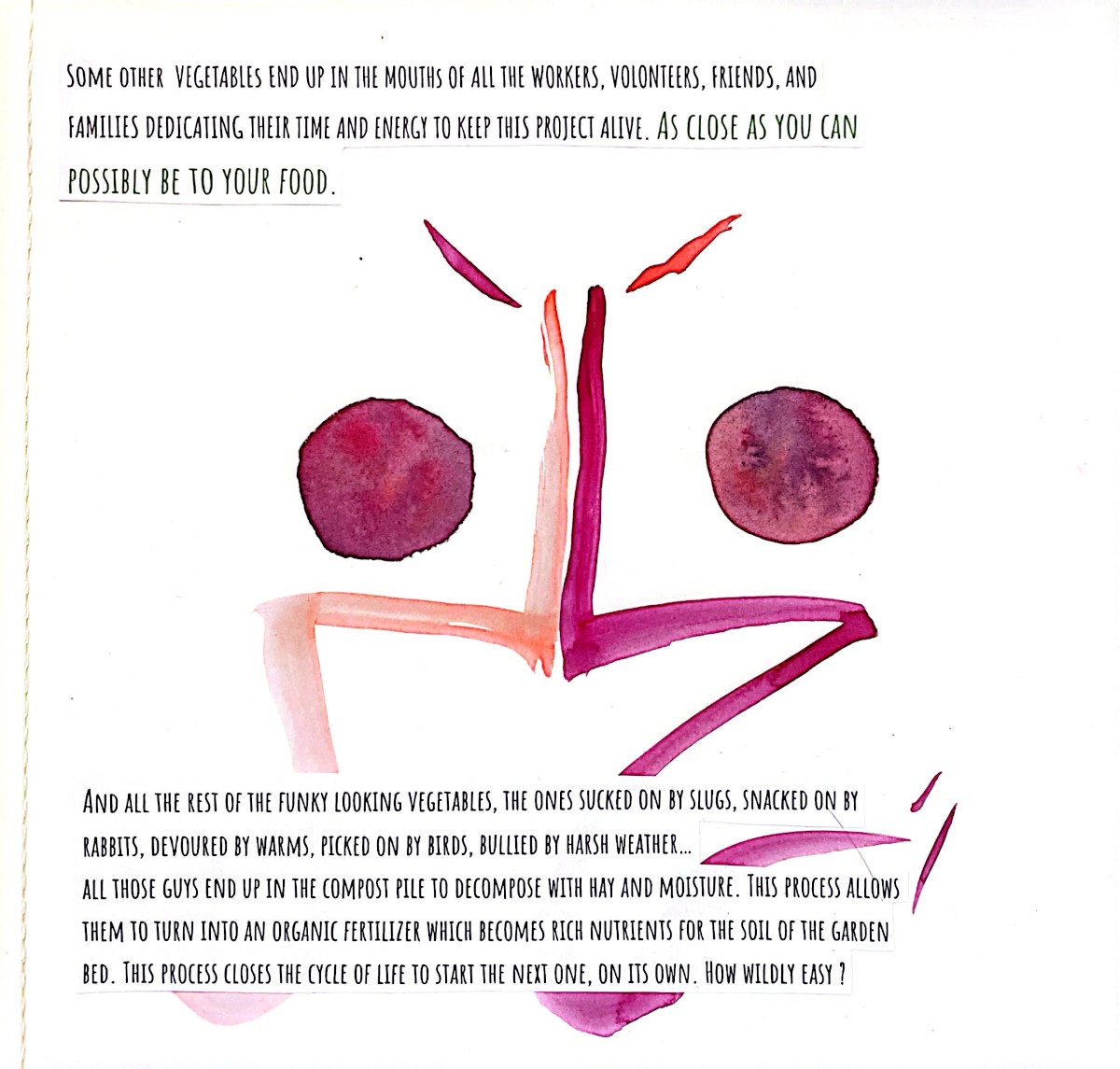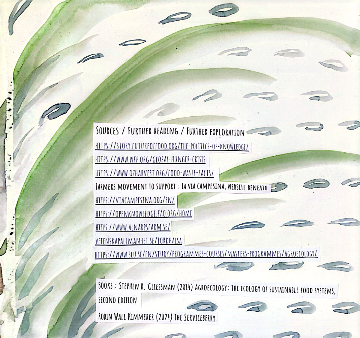 This grew out of two months alongside people who care deeply about food, land, and community. Seeds were planted...and many learnings, realizations, and watercolor brush strokes here come together as a way to lift eco-social and activist practices that bring attention to human life in relation with nature, in an ever so fast-paced society. A relation that is crucial for our well-being and survival, and it asks us to return to it with more care.