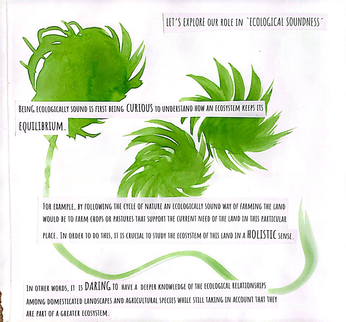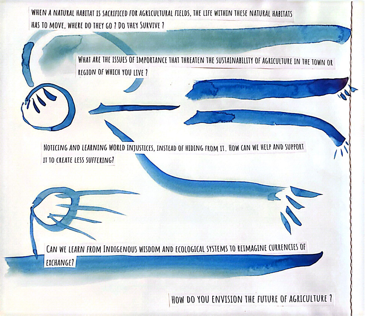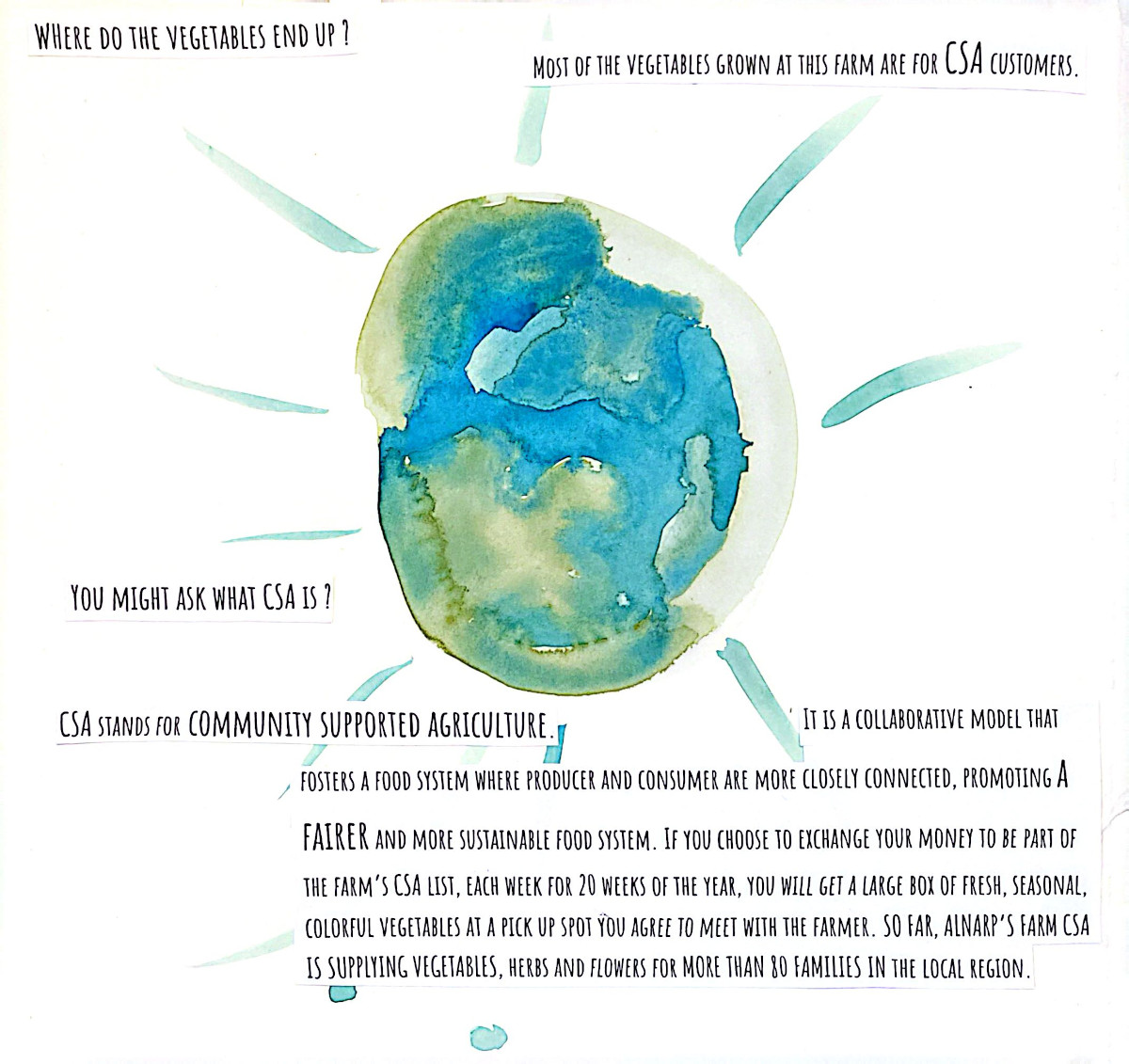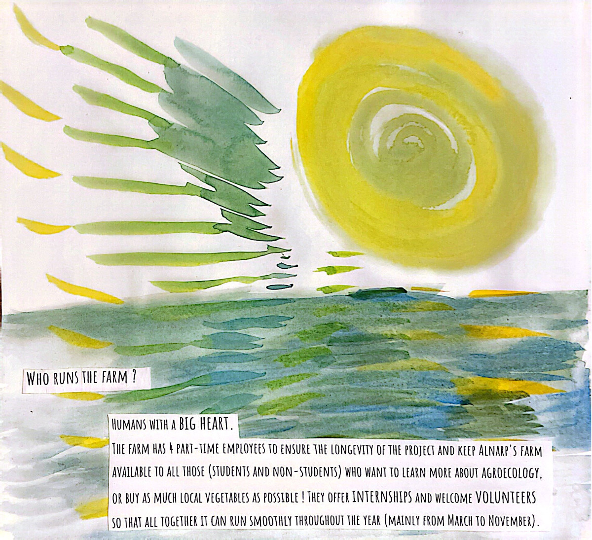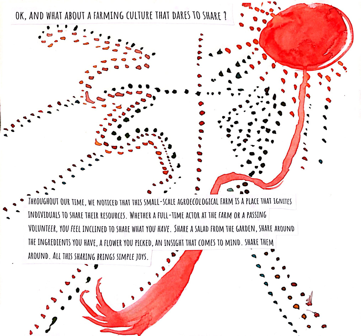 This grew out of two months alongside people who care deeply about food, land, and community. Seeds were planted...and many learnings, realizations, and watercolor brush strokes here come together as a way to lift eco-social and activist practices that bring attention to human life in relation with nature, in an ever so fast-paced society. A relation that is crucial for our well-being and survival, and it asks us to return to it with more care.
